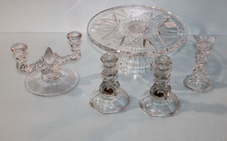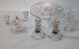 628 Glass Cake Stand & Four Various Candlesticks