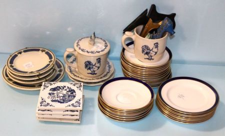 633 Four Porcelain Blue and White Coasters, Cups, Nineteen Spode China Saucers, Eight Spode Bread/Butter Dishes, Old Ivory Syracuse China Plates, Barnyard Toile 4" plates