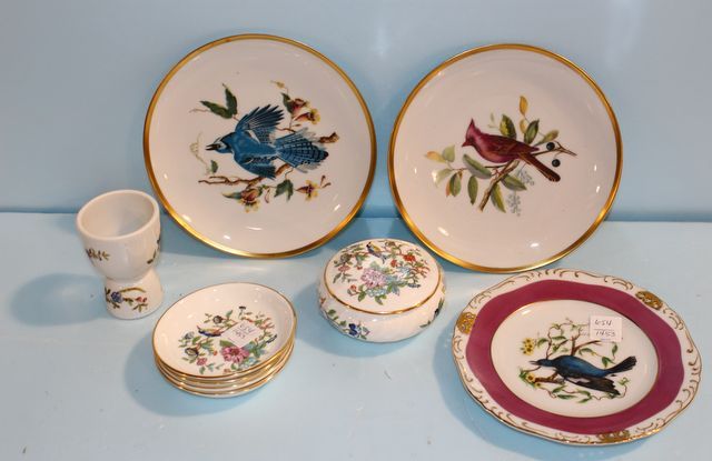 654 Three Handpainted Bird Plates, Egg Cup, Covered Jar & Four Ansley Dishes