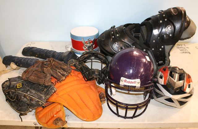 693 Football Helmet, Shoulder Pads & Drum Major Hat and Grouping of Vintage Baseball Equipment & Bike Helmet