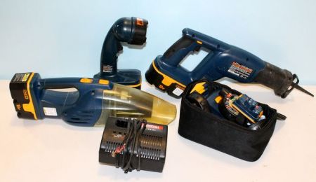 898 18V Ryobi Set, Wet/Dry Vac, Reciprocating Saw, Flashlight, Accessories, Three Batteries & Charger