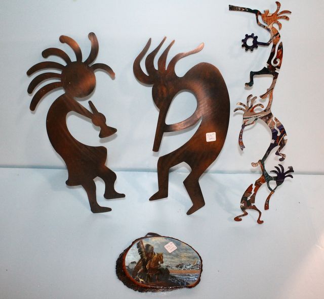 908 Three Metal Kokopelli Wall Decorations & Wood Indian Plaque