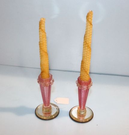 937 Pair of Pink with Mirrored Base Candlesticks