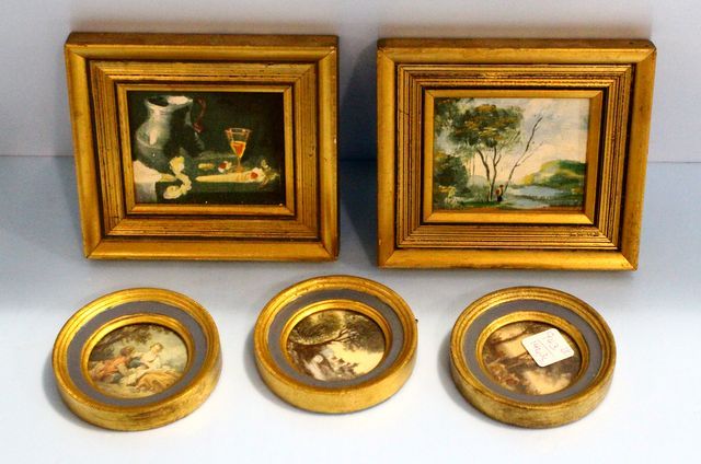 943 Three Small Round Victorian Pictures & Two Small Stillife Pictures