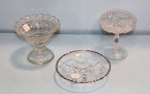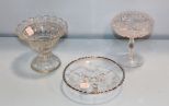 951 Two Pressed Glass Compotes and Etched Silver Trim Dish