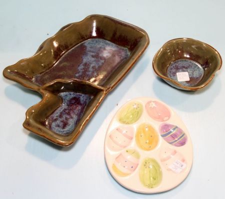 Red leaf pottery Mississippi State divided dish, saucer dish (chip) and deviled egg dish Red leaf pottery Mississippi State divided dish, saucer dish (chip) and deviled egg dish