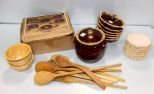 Including group of wooden spoons, ceramic bowls, cookie jar, saucer and four piece stoneware set Including group of wooden spoons, ceramic bowls, cookie jar, saucer and four piece stoneware set