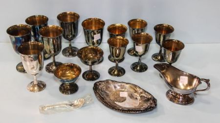 Two 9" silverplate oval trays, silverplate sugar spoon, gravy boat, two silverplate champagne glasses, six 5 1/2" silverplate cups & six 6 1/2" silverplate cups Two 9" silverplate oval trays, silverplate sugar spoon, gravy boat, two silverplate champagne glasses, six 5 1/2" silverplate cups & six 6 1/2" silverplate cups
