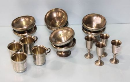 Four small pewter cups, four pewter cordials and eight pewter shrimp cocktail cups (no liners) Four small pewter cups, four pewter cordials and eight pewter shrimp cocktail cups (no liners)