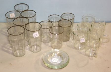 Six glass coffee cups, six saucers, six tea glasses & five juice glasses Six glass coffee cups, six saucers, six tea glasses & five juice glasses