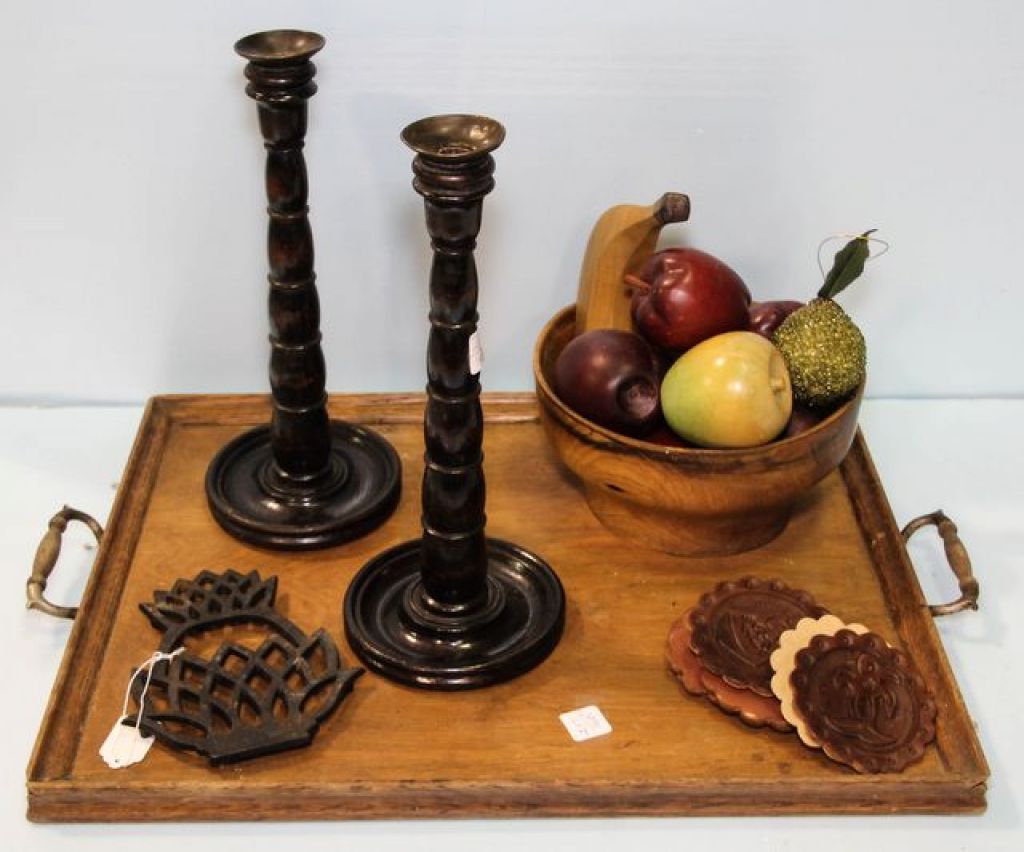 Large wood tray, pair of wood candlesticks, leather coasters, wood bowl with fruit and iron trivet Large wood tray, pair of wood candlesticks, leather coasters, wood bowl with fruit and iron trivet