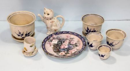 Five small various size flower pots, cup/saucer, cat teapot and decorative plate Five small various size flower pots, cup/saucer, cat teapot and decorative plate