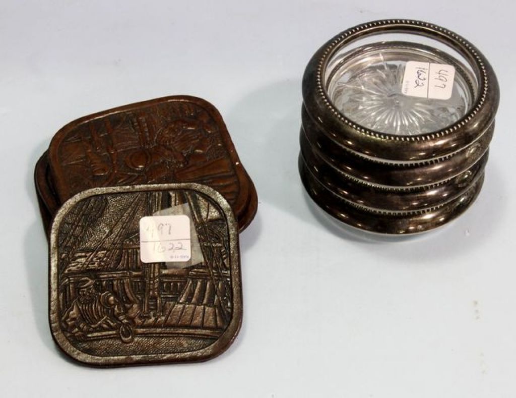 Four silverplate and glass coasters and leather coasters Four silverplate and glass coasters and leather coasters