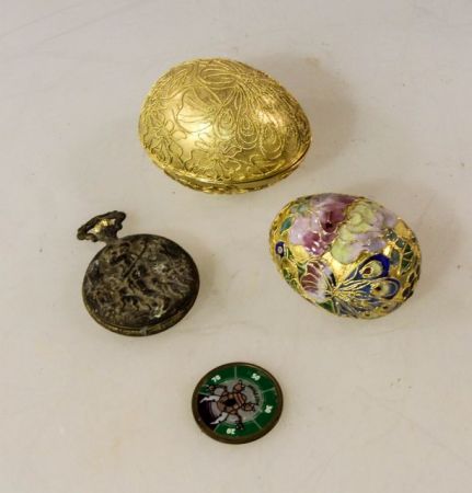 Gold egg with enamel work egg inside, pokomo token & rusted pocket watch Gold egg with enamel work egg inside, pokomo token & rusted pocket watch