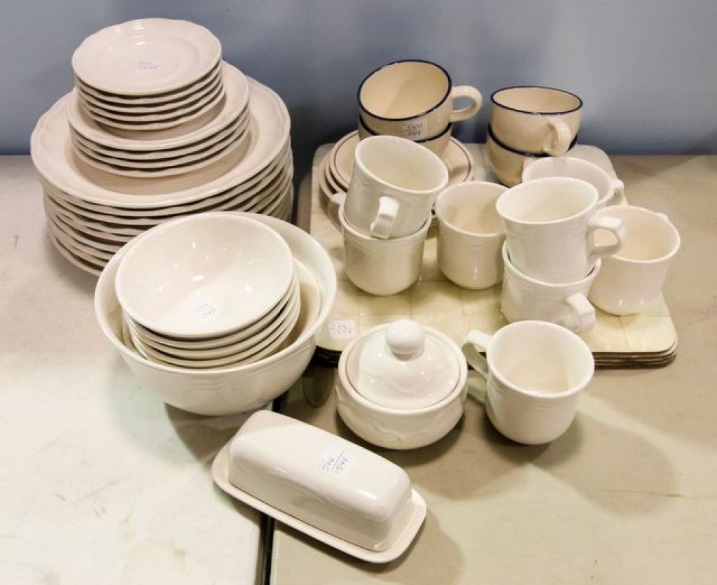 Nine dinner plates, four salad plates, eight cups, five saucers, sugar, bowls, other cups/saucers & table mats Nine dinner plates, four salad plates, eight cups, five saucers, sugar, bowls, other cups/saucers & table mats