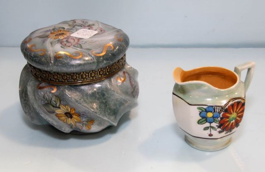 659 Lusterware Pitcher & Painted Glass Powder Jar
