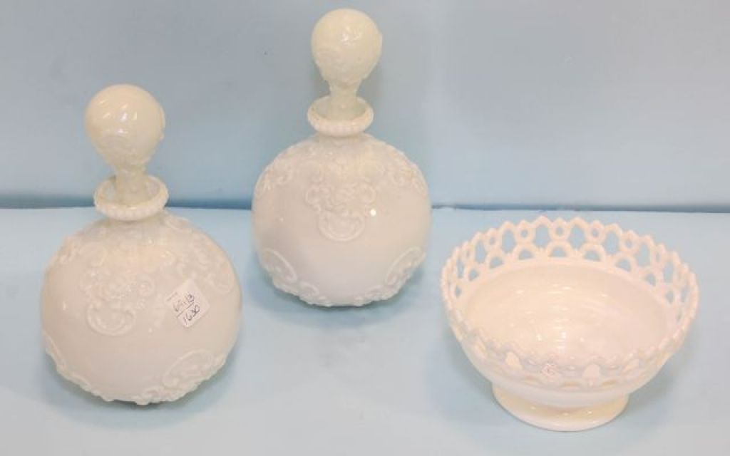 691 Two Milk Glass Barber Bottles & Reticulated Bowl