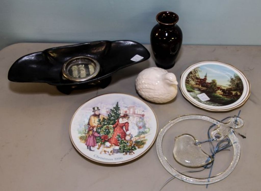1110 Two Plates, Clear Hanging Bird, Black Console Bowl, Bird & Oriental Vase