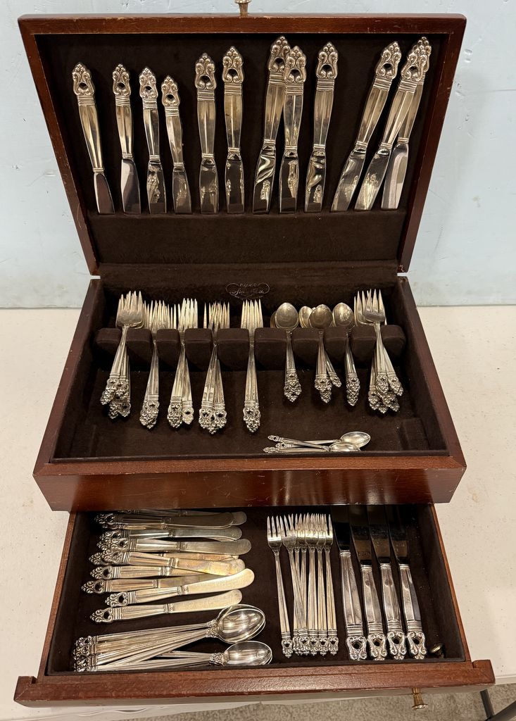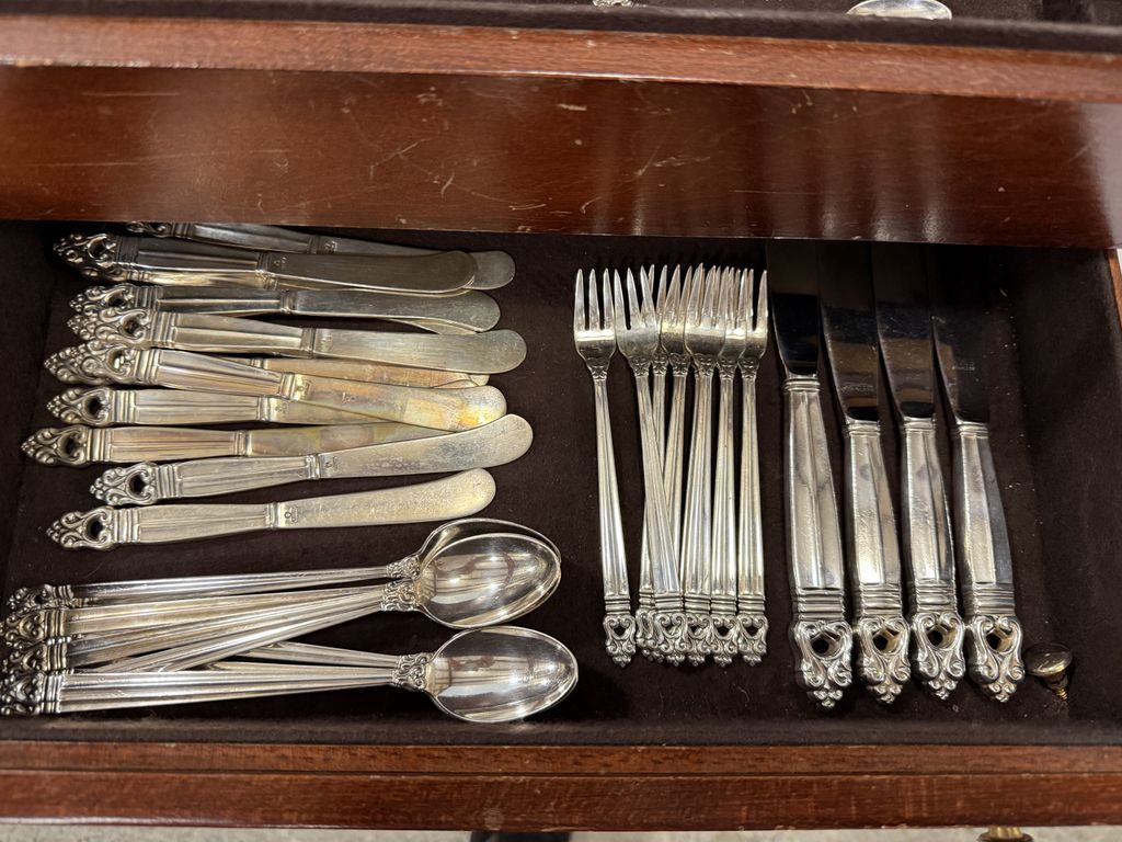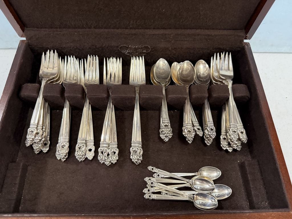 24 salad forks, 10 lunchoen forks, 8 dinner forks, 24 teaspoons, 12 butter knives, 10 Ice Tea Stir Spoons, 8 cocktail forks, 8 luncheon knives, 8 dinner knives, 9 demitasse spoons, 131.61 ozt total, Location Front Case 24 salad forks, 10 lunchoen forks, 8 dinner forks, 24 teaspoons, 12 butter knives, 10 Ice Tea Stir Spoons, 8 cocktail forks, 8 luncheon knives, 8 dinner knives, 9 demitasse spoons, 131.61 ozt total, Location Front Case