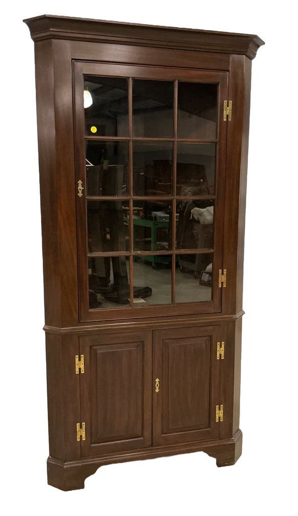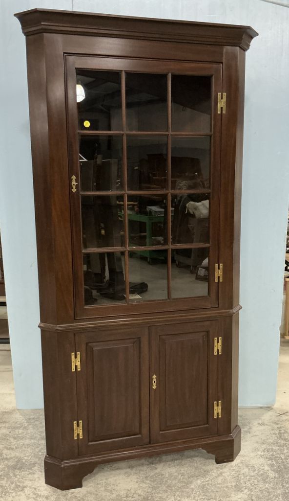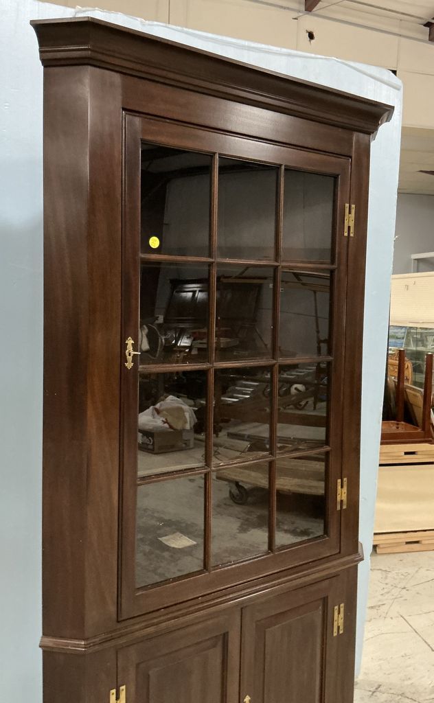 Henkel Harris Virginia Galleries Mahogany Corner Cabinet, 84"h., 43"w, lighted, has keys, good condition Henkel Harris Virginia Galleries Mahogany Corner Cabinet, 84"h., 43"w, lighted, has keys, good condition