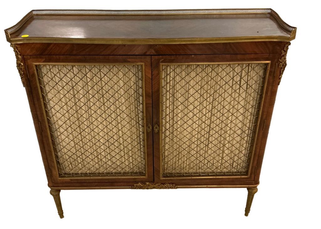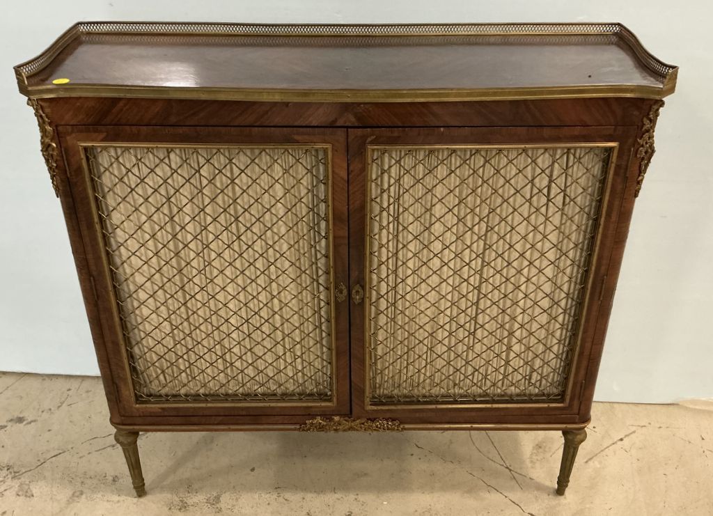 40"h., 41"w French Empire Rosewood Cabinet, no interior shelves, skirted mesh doors. 40"h., 41"w French Empire Rosewood Cabinet, no interior shelves, skirted mesh doors.