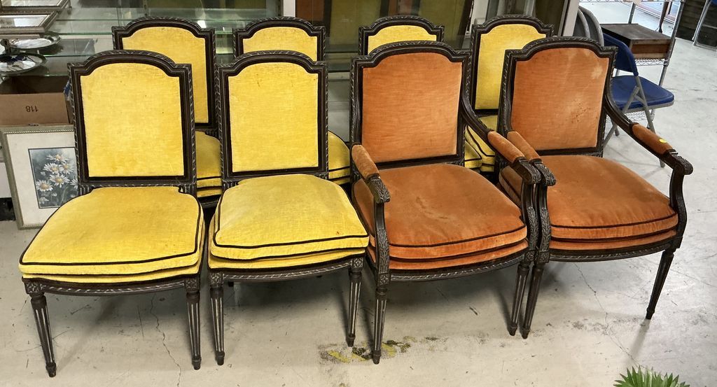 6 French Distressed Finish Dining Chairs, 6 sides, 8 arms. 6 French Distressed Finish Dining Chairs, 6 sides, 8 arms.