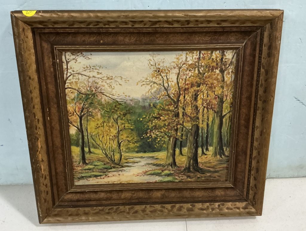VTG Landscape Painting on Board framed, 19"h., 19"w, Location Front Shelves VTG Landscape Painting on Board framed, 19"h., 19"w, Location Front Shelves