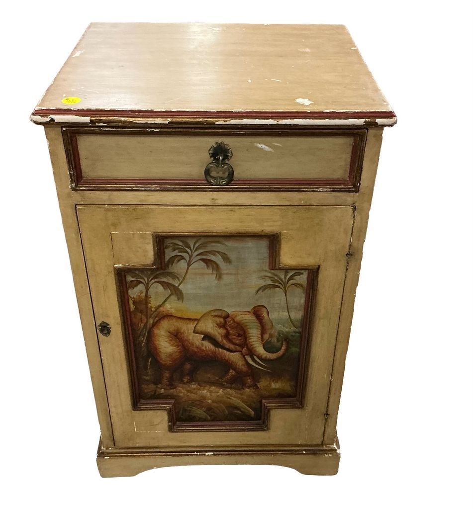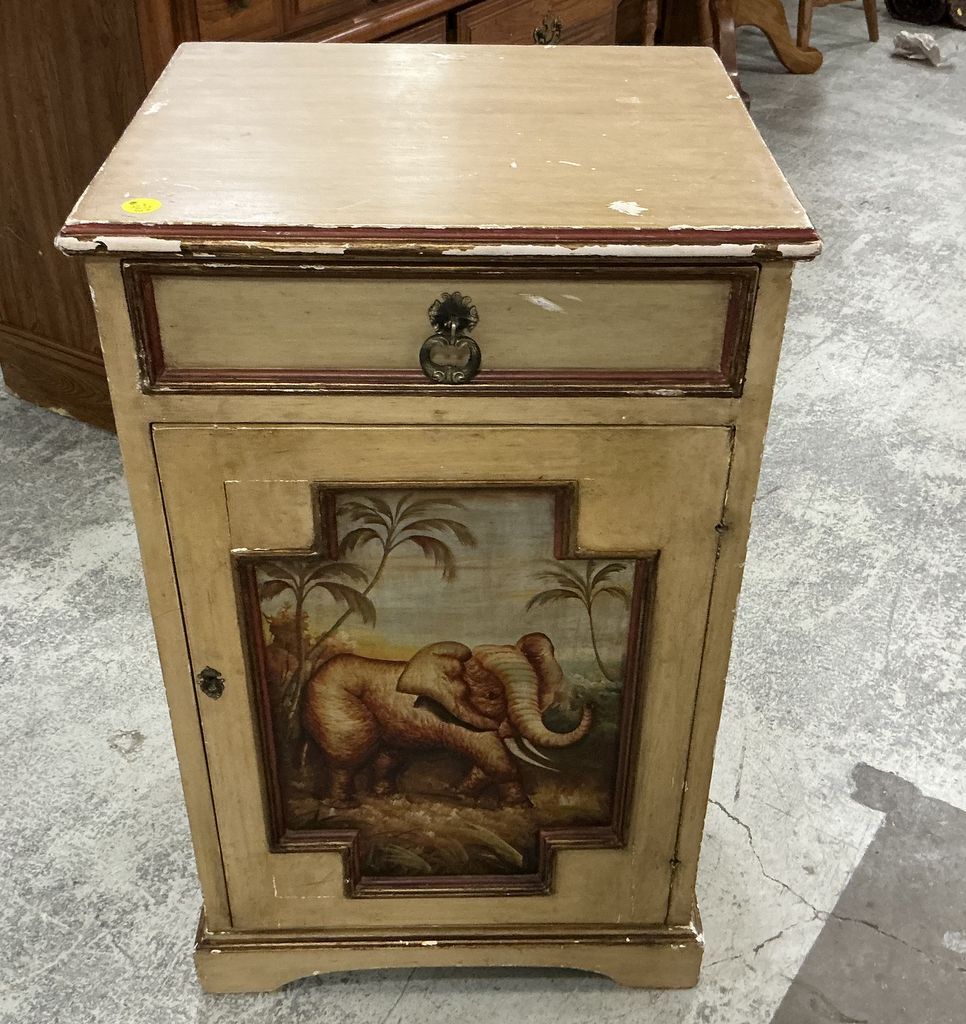Decorative Factory Painted Elephant Cabinet, chipped painted, 31"h., 19"w. Decorative Factory Painted Elephant Cabinet, chipped painted, 31"h., 19"w.