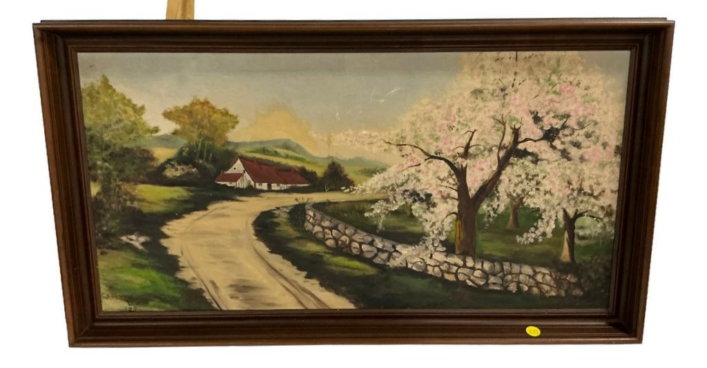 Signed Caldwell 1928 Landscape Painting on canvas, framed, 23"h., 40"w Location Front Shelve Signed Caldwell 1928 Landscape Painting on canvas, framed, 23"h., 40"w Location Front Shelve