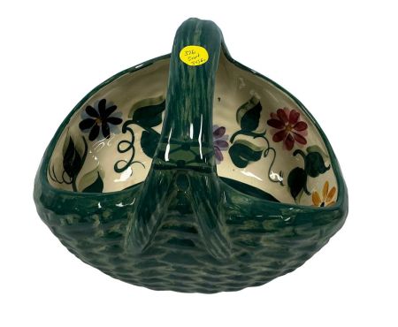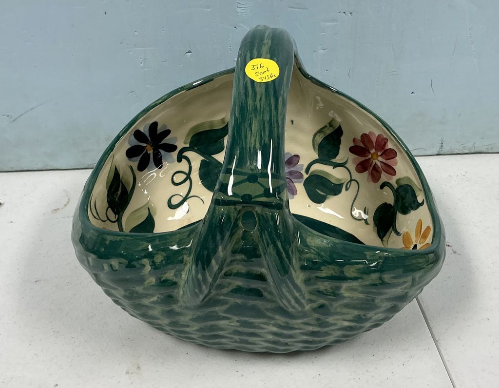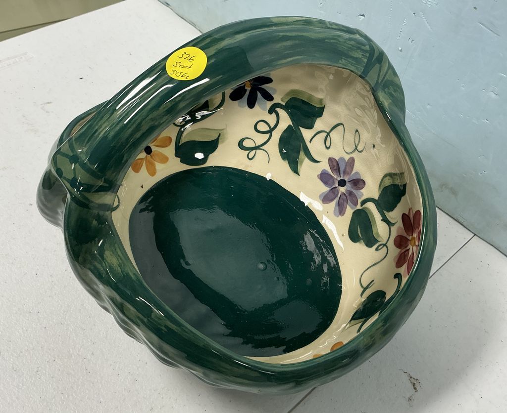 Gail Pittman Ceramic Carrying Basket, hand painted, 1993, 9"h., 13"dia, Location Front Shelves Gail Pittman Ceramic Carrying Basket, hand painted, 1993, 9"h., 13"dia, Location Front Shelves