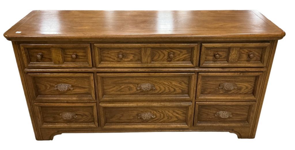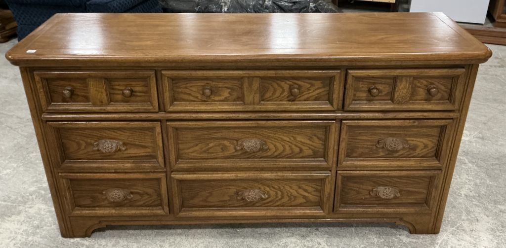 383 Dixie Co. Vtg Oak Triple Dresser 32"h., 64"w