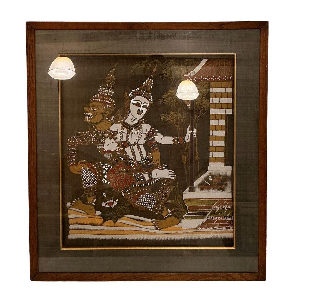 Framed 1970s Thai Painting On Silk Print 25"h, 23"w Framed 1970s Thai Painting On Silk Print 25"h, 23"w