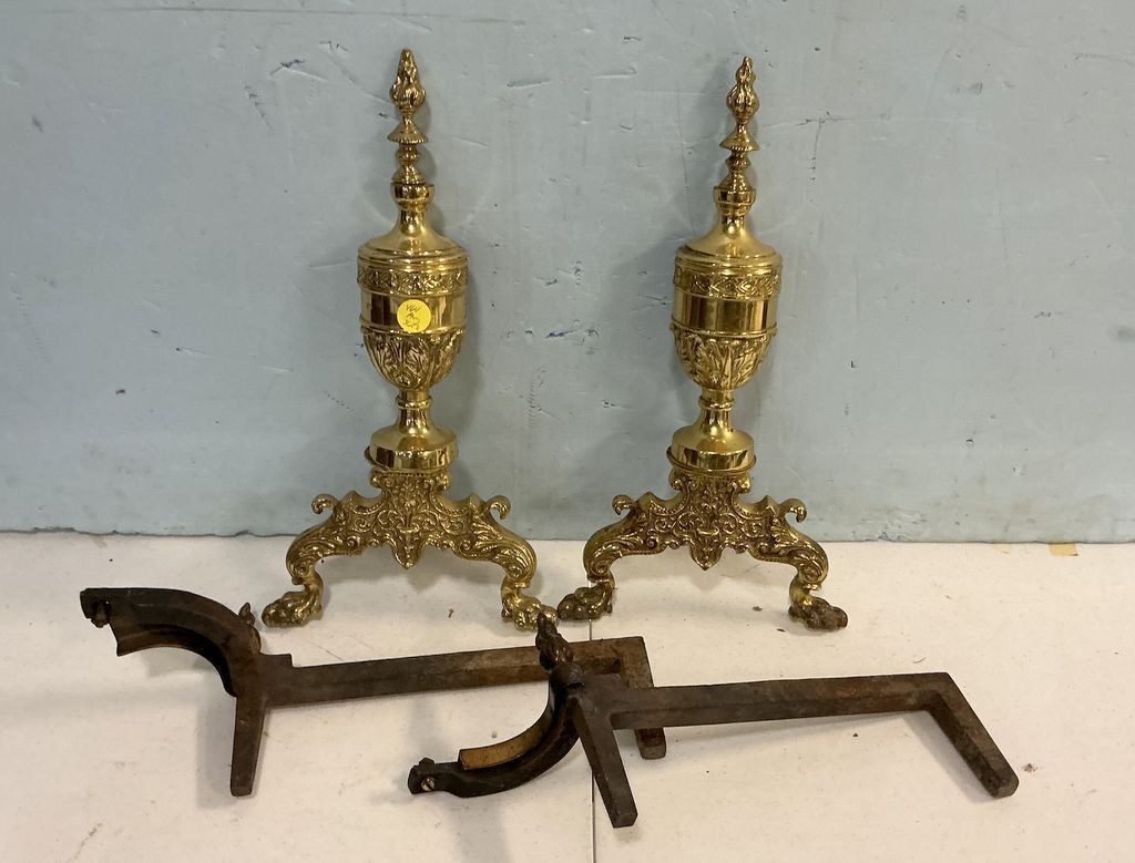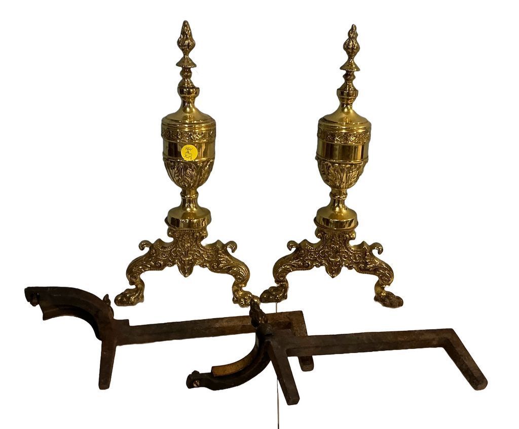 Pair of Neoclassical Style Brass Andirons 18"h, Location Front Shelves Pair of Neoclassical Style Brass Andirons 18"h, Location Front Shelves