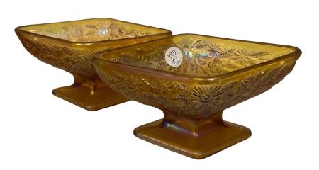 Indiana Amber Carnival Glass Pedestal Diamond Shaped Bowls 3"h 7"w Location Left Shelves 3 Indiana Amber Carnival Glass Pedestal Diamond Shaped Bowls 3"h 7"w Location Left Shelves 3