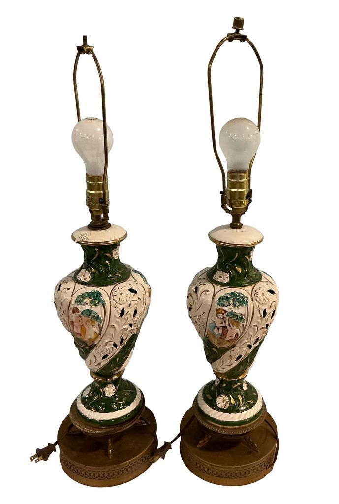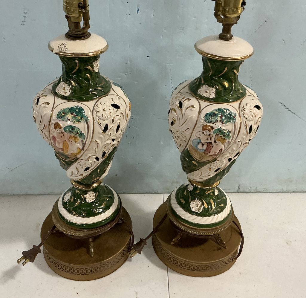 Pair Vintage Italian Capodimonte Lamps 29"h Location Front Shelves Pair Vintage Italian Capodimonte Lamps 29"h Location Front Shelves