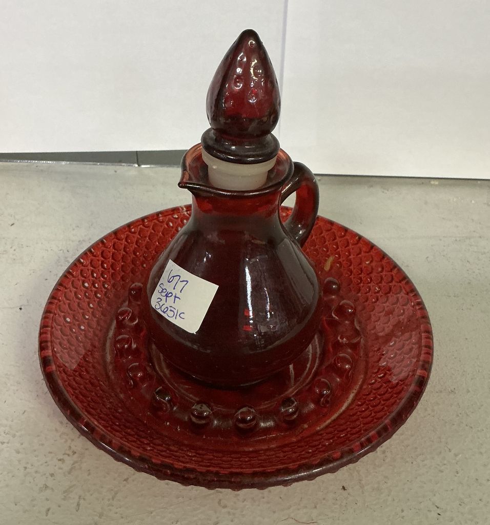 677 2pc Red Glass Bottle 6"h and Dish 6"d