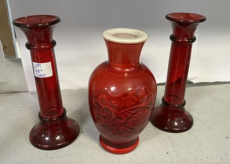 2pc Ruby red glass candlesticks 7"h , Avon Spring Bouquet 6.5"h Location Left Shelves 1 2pc Ruby red glass candlesticks 7"h , Avon Spring Bouquet 6.5"h Location Left Shelves 1