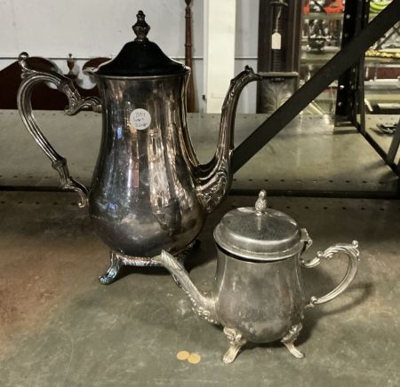 Two Silver Plate Water and Coffee Pitchers, Location Back Metal Shelves Two Silver Plate Water and Coffee Pitchers, Location Back Metal Shelves