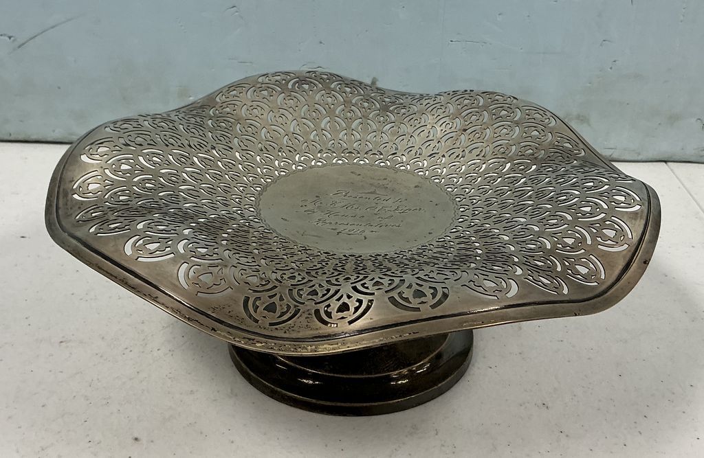 1916 Sterling Pierced Compote, monogrammed, 4"h., 10"dia, Location Case by Office 1916 Sterling Pierced Compote, monogrammed, 4"h., 10"dia, Location Case by Office