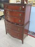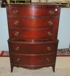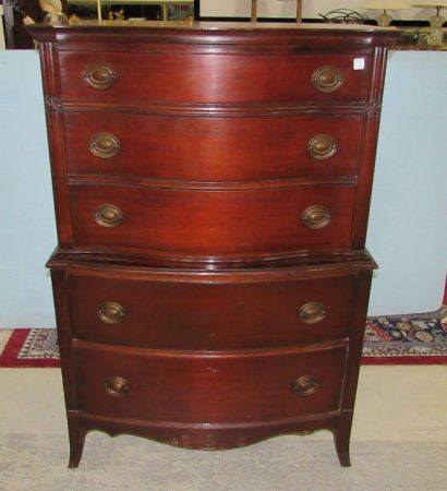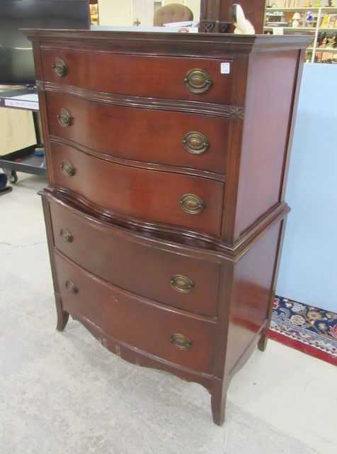 Five drawers, has some veneer pieces missing, 53"h., 36"w., 21"d. Five drawers, has some veneer pieces missing, 53"h., 36"w., 21"d.