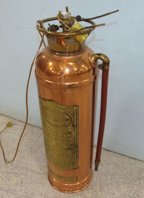 Converted to lamp, copper and brass, lamp insert needs repair, 24"h. Converted to lamp, copper and brass, lamp insert needs repair, 24"h.