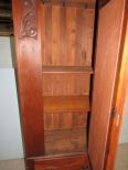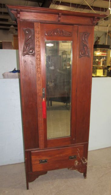 Mirrored front, Shelves inside, carved design, one drawer, Top has some damage, wear spots, 75"h., 36"w. Mirrored front, Shelves inside, carved design, one drawer, Top has some damage, wear spots, 75"h., 36"w.