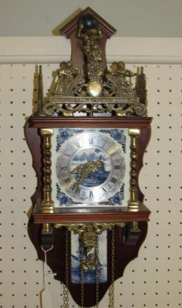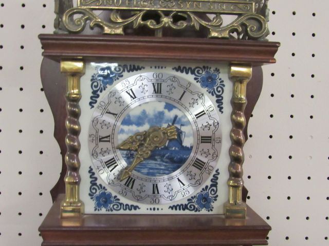 Missing weights, Blue and white ceramic insets, ornate, has pendulum, 27"h. Missing weights, Blue and white ceramic insets, ornate, has pendulum, 27"h.