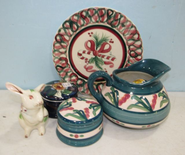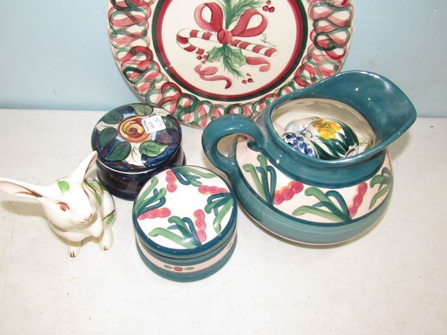 Covered Dish 1988, plate 1993, Rabbit 2003, pitcher 1988, Nine eggs. Covered Dish 1988, plate 1993, Rabbit 2003, pitcher 1988, Nine eggs.