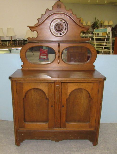 Double Mirror with display shelf, crest, two door, with storage shelves, 75"h., 46"w. Double Mirror with display shelf, crest, two door, with storage shelves, 75"h., 46"w.