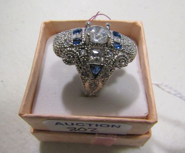 Surrounded by clear and blue stones, size 6. Surrounded by clear and blue stones, size 6.