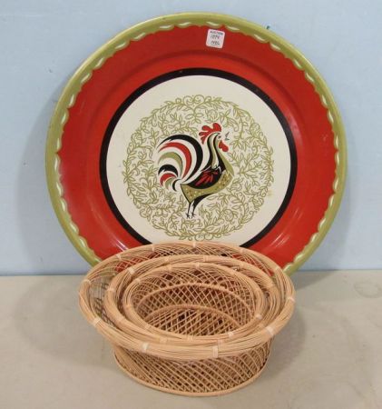 1074 Three Woven Baskets and Large Roster Tin Charger
