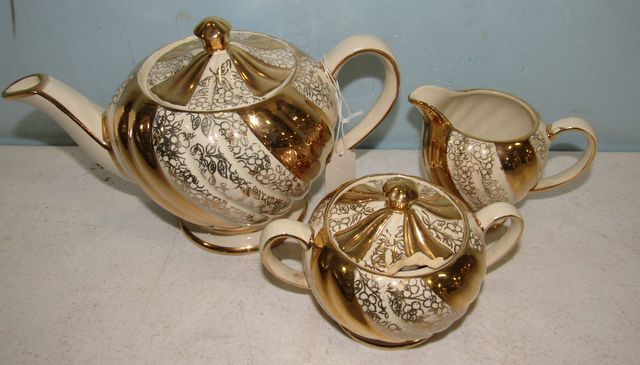 Teapot, Creamer, Sugar (has chip on lid), Hand painted. Teapot, Creamer, Sugar (has chip on lid), Hand painted.