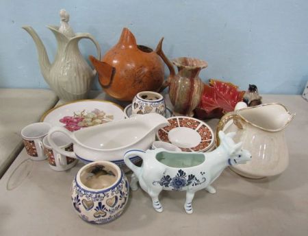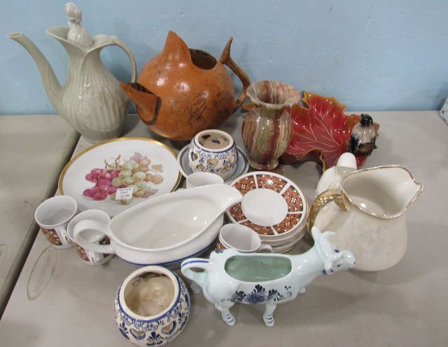 Cups, saucers, pitchers, leaf dish, DBL cow, English creamer, marble vase, Cups, saucers, pitchers, leaf dish, DBL cow, English creamer, marble vase,