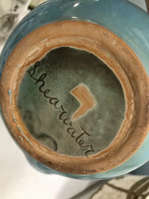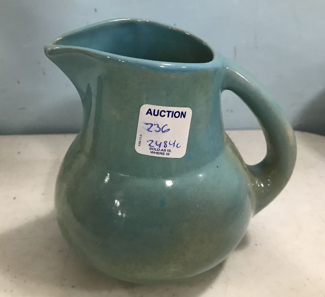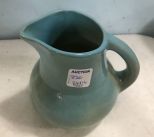 Shearwater Pottery Pitcher, glazed, signed on bottom, alkaline blue glaze, probably by Peter Anderson, good condition, 5 1/2"h. Shearwater Pottery Pitcher, glazed, signed on bottom, alkaline blue glaze, probably by Peter Anderson, good condition, 5 1/2"h.